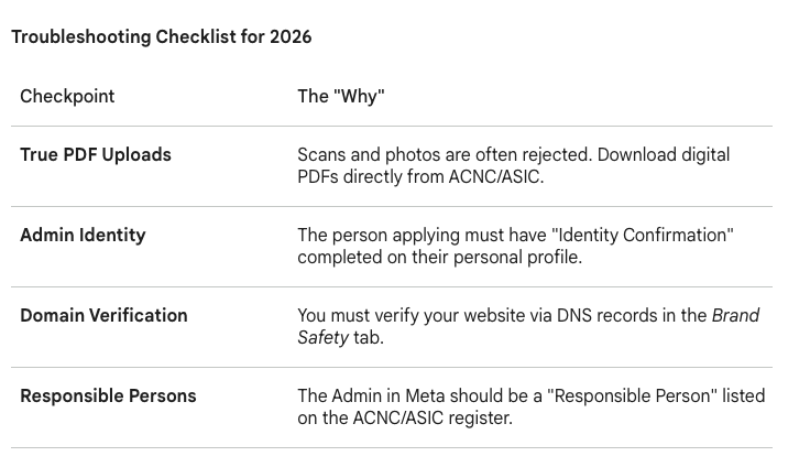 Meta’s 2026 integrity system uses AI-driven OCR (Optical Character Recognition) to cross-reference your documents with government databases like the ACNC or ASIC.