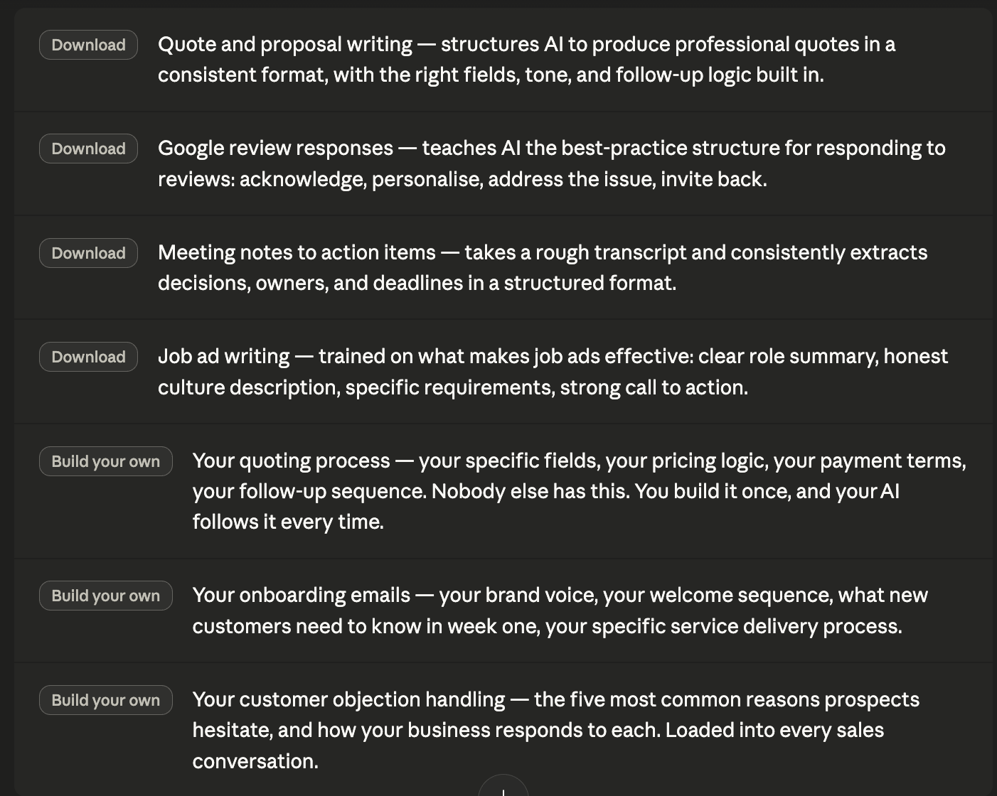 2. Identify one repeated task that currently requires you to give a long briefing every time — or where the AI output is inconsistent because it doesn't know your standards. Good candidates: quote follow-ups, review responses, social captions, staff updates.